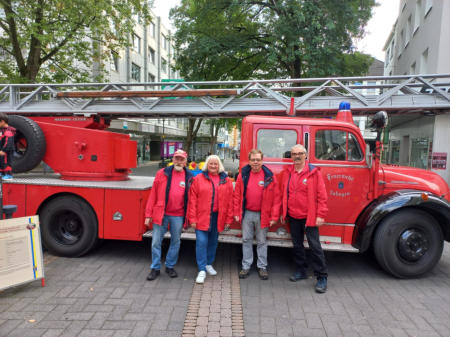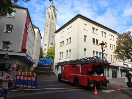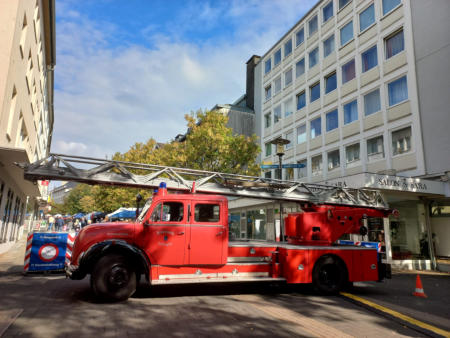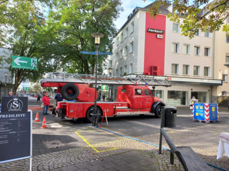 Die Drehleiter der Oldtimerfreunde Feuerwehr Solingen e.V. diente als schmuckvolleBlockage der Zufahrt zum Veranstaltungsort des internationalen Kulturfestes