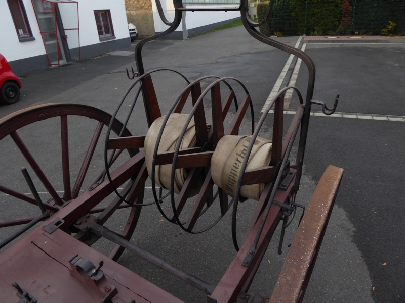 mit Kasten und vielen Halterungen für Geräte / Strahlrohre etc. Halterungen für HakenleiternTyp : 2 Haspeln B – SchläucheFarbe : dunkelrotStandort : WaldBild : Hof alte Wache Wald - Raffaelstraße