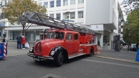 Die Drehleiter der Oldtimerfreunde Feuerwehr Solingen e.V. diente als schmuckvolleBlockage der Zufahrt zum Veranstaltungsort des internationalen Kulturfestes